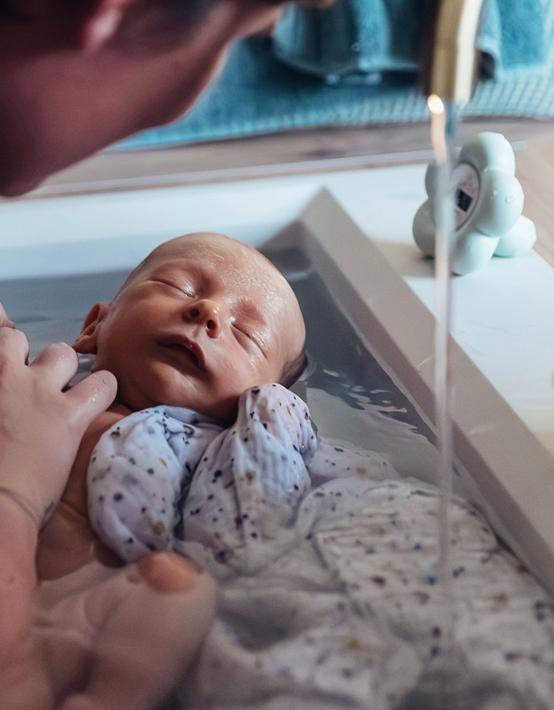 Grâce à une ambiance apaisante (eau chaude, lange, lumière tamisée…), ce bain est un véritable soin émotionnel pour le nouveau-né.